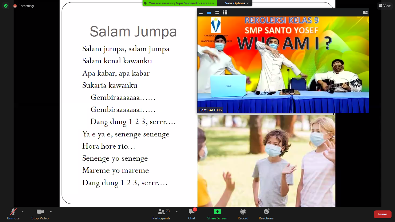 Para frater membawakan rekoleksi dengan banyak selingan sehingga anak-anak tidak jenuh, di antaranya menyanyi bersama, memutar video tentang motivasi dan makna orang tua yang sangat berharga bagi anak-anak, dan juga menampilkan video orasi dari Keisha yang telah memenangkan Juara II Lomba Orasi Se-Jawa Bali. Orasi Keisha menjadi penyemangat teman-temannya untuk mencintai budaya sopan santun.