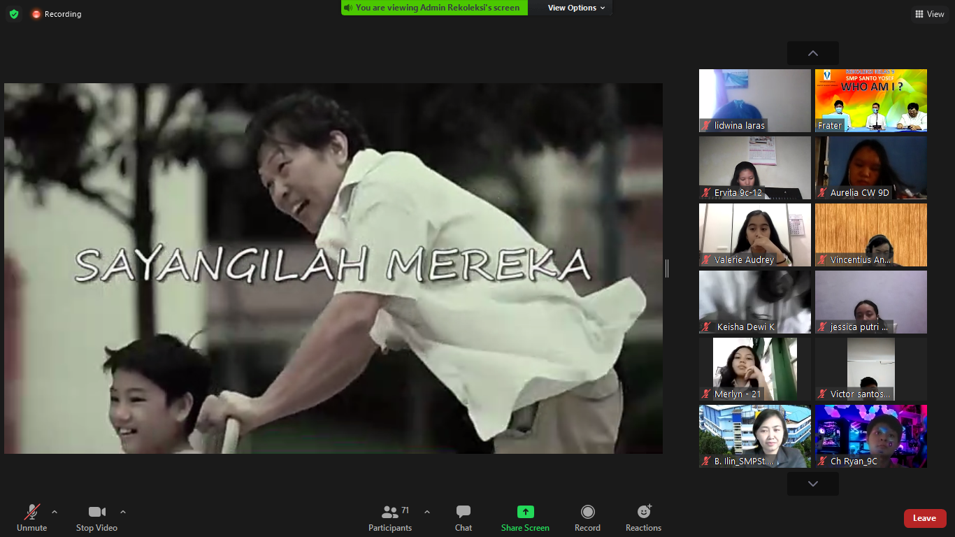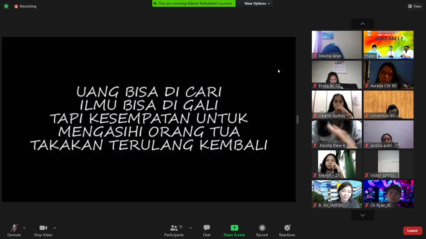 Rekoleksi ini diberikan untuk siswa/i kelas IX. Acara dibagi dalam dua sesi, yakni sesi pertama untuk kelas IX A dan IX B (pukul 07.30 – 09.30 WIB) dan sesi kedua untuk kelas IX C dan IX D (pukul 10.00 – 12.00 WIB).